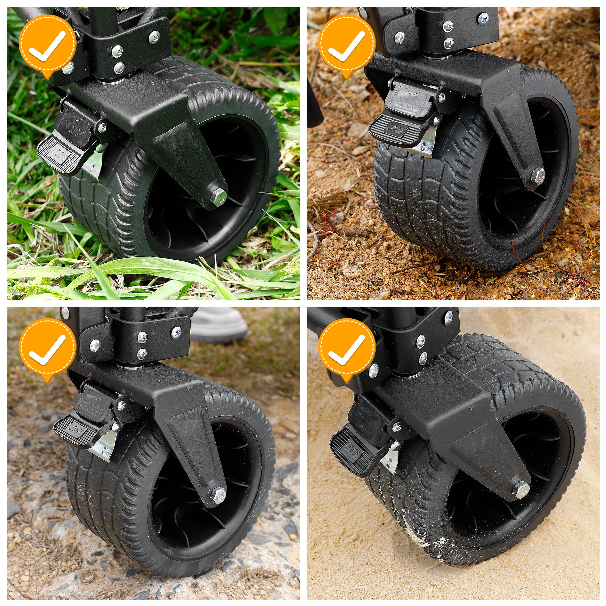 • Sturdy wheels, 3.6 inches wide, can rotate 360 degrees are suitable for various road surfaces and equipped with brakes to prevent sliding